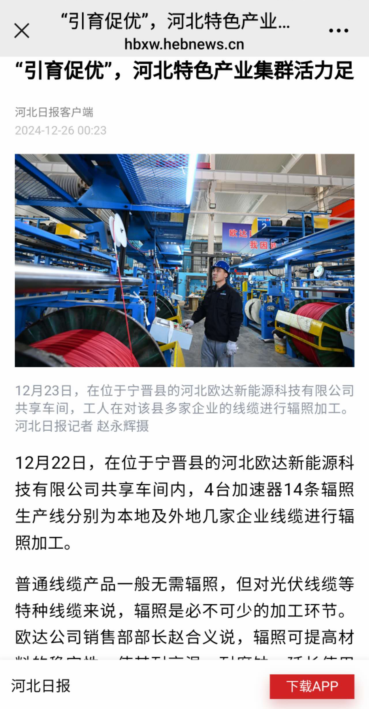 12ÔÂ22ÈÕ£¬ÔÚλÓÚÄþ½úÏØµÄºÓ±±Å·´ïÐÂÄÜÔ´¿Æ¼¼ÓÐÏÞ¹«Ë¾¹²Ïí³µ¼äÄÚ£¬4̨¼ÓËÙÆ÷14Ìõ·øÕÕÉú²úÏß»®·ÖΪÍâµØ¼°ÍâµØ¼¸¼ÒÆóÒµÏßÀ½øÐзøÕÕ¼Ó¹¤¡£